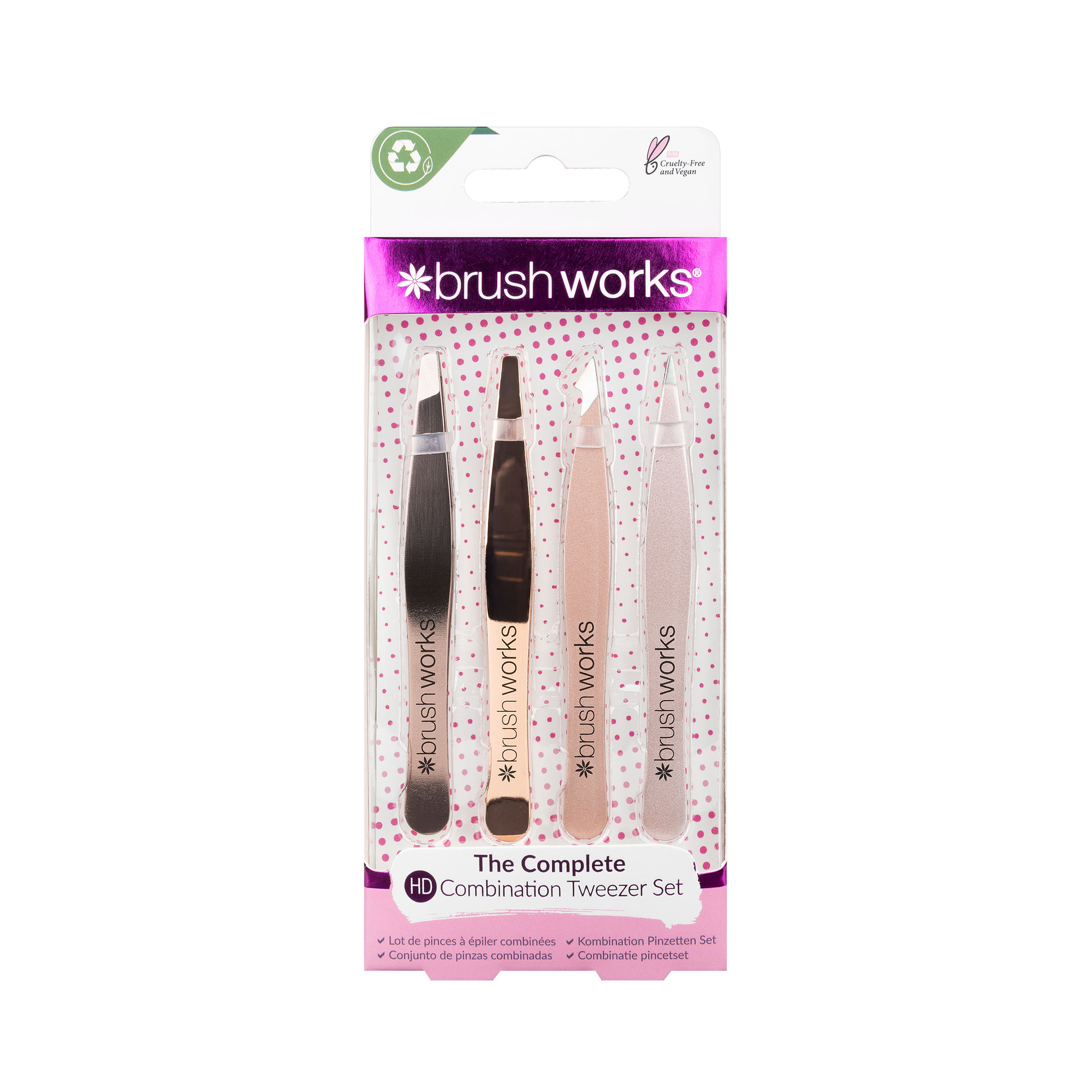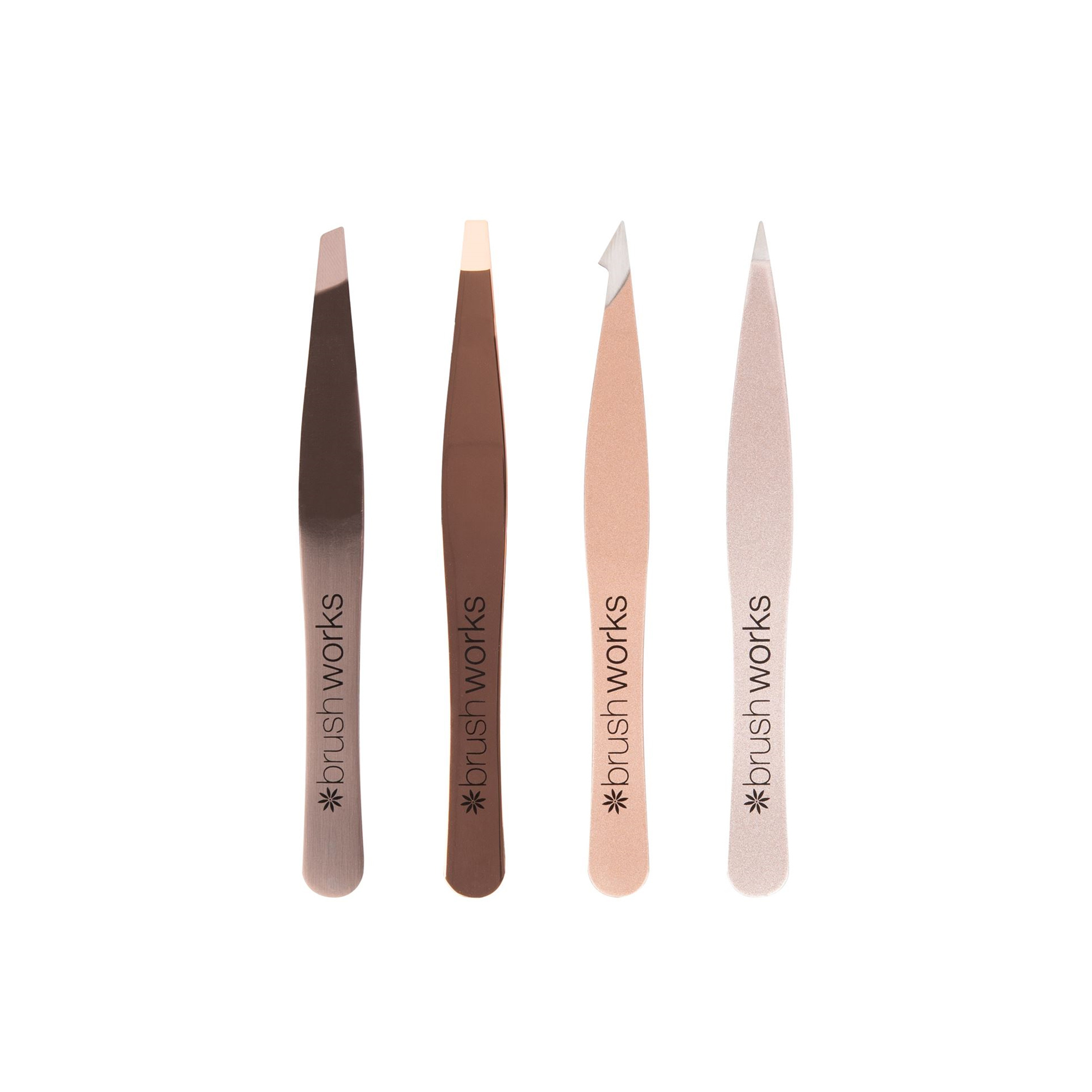 De Brushworks HD 4 Piece Combination Tweezers Set - Bronze is een mooie, opvallende set met 4 verschillende pincetten voor verschillende doeleinden. De set bestaat uit pincetten in neon kleuren.