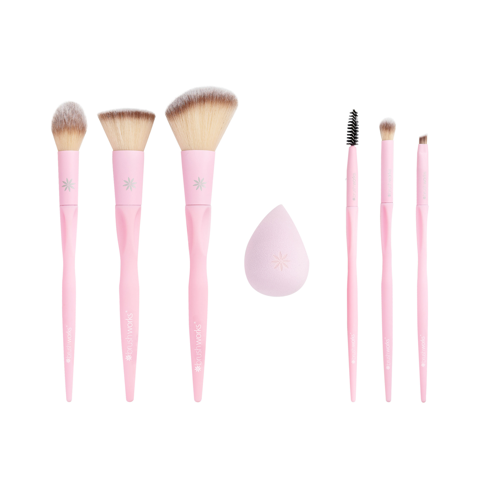 In de kwastenset zit:- Een schuin afgesneden kwast die perfect is voor het aanbrengen van blush, bronzer of contour poeder. - Een kleine, taps toelopende kwast waar je highlighter of blush mee kunt aanbrengen. - Een platte kwast, ideaal voor het aanbrengen van vloeibare make-up producten. - Een make-up spons, hiermee kun je je foundation of BB Cream super natuurlijk en egaal aanbrengen. - Een wenkbrauwkam, perfect voor het kammen van de wenkbrauwharen. - Een oogschaduw blending brush. Met deze kwast kun je oogschaduw aanbrengen en oogschaduw blenden! - Een klein, schuin afgesneden kwastje. Ideaal voor het tekenen van de wenkbrauwen of het aanbrengen van eyeliner.