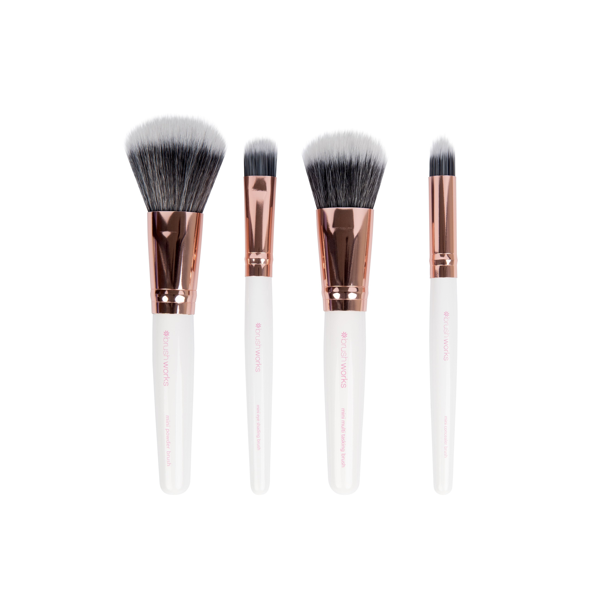 De Multi-Tasking Brush: een make-up kwast die perfect is voor het aanbrengen van dunne make-uplagen voor een professionele en egale finish. De kwast kan worden gebruikt voor zowel, blush, bronzer en poeder. De Mini Powder Brush: ontworpen om de perfecte hoeveelheid poeder mee aan te brengen. De taklon haren zijn met de hand gesneden om een voorgevormde en gedefinieerde look te creëren. De zachte haren zorgen voor een egale basis. De Mini Concealer Brush: geschikt voor zowel crème als vloeibare producten. De kwast is ideaal voor het bedekken van donkere kringen, oneffenheden en andere imperfecties op het gezicht. Door de stijve haren van de kwast krijg je de perfecte dekking. De Mini Foundation/Eye Shading Brush: gevormd en gesneden om te gebruiken rondom de ogen. Zo kan je de kwast bijvoorbeeld gebruiken om oogschaduw mee te blenden, zodat er een vlekkeloze oog look ontstaat.