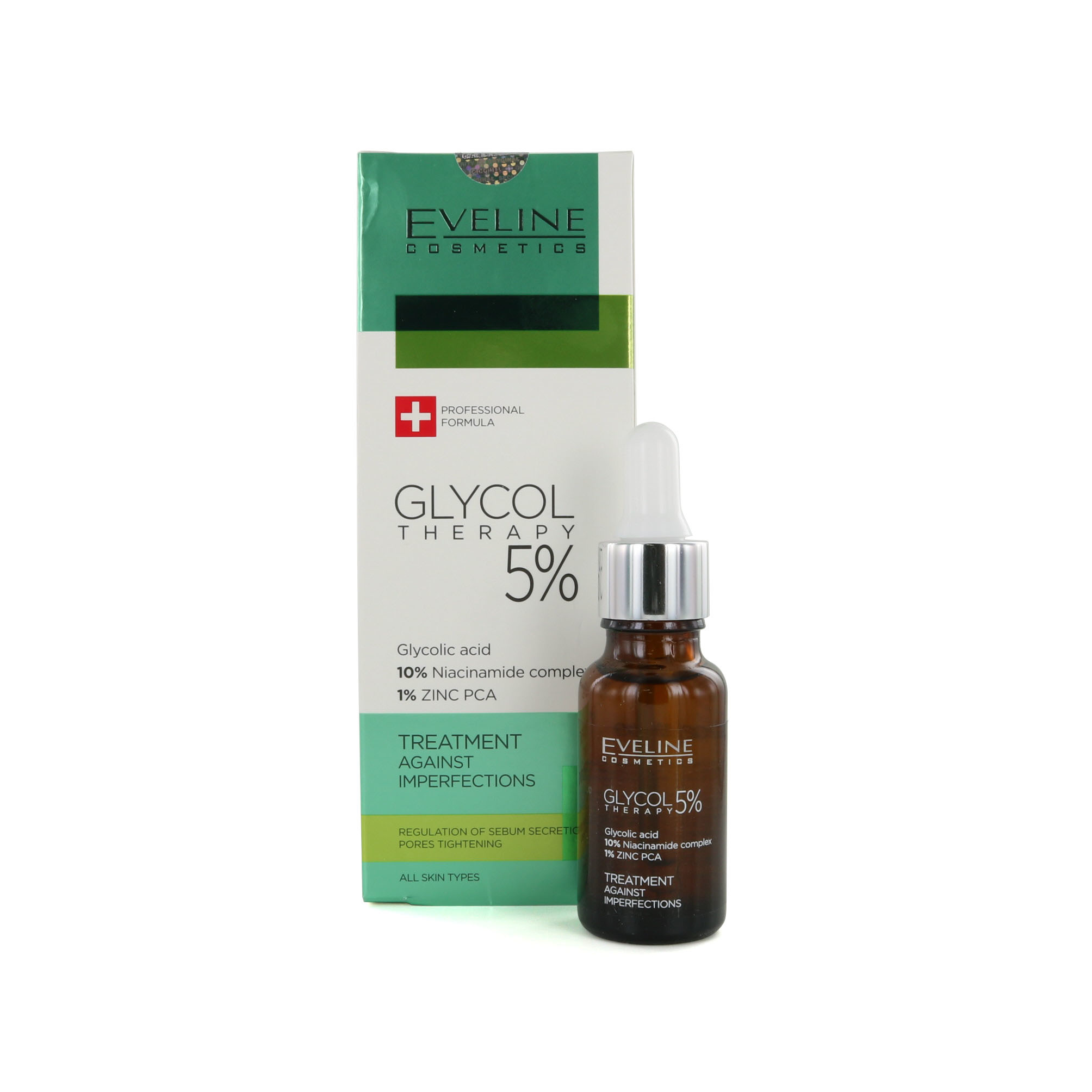 De Eveline Glycol Therapy 5% Treatment Against Imperfections - 18 ml is bedoeld voor de huid die vatbaar is voor oneffenheden. De formule is gebaseerd op een 10% complex met niacinamide en 1% zinkcomplex voor maximale effectiviteit. Bij regelmatig gebruik van het product zullen onzuiverheden worden vermindert. Ook worden poriën minder zichtbaar en wordt er minder talg aangemaakt. Hierdoor wordt de huid niet vettig en zullen poriën minder snel gaan verstoppen.