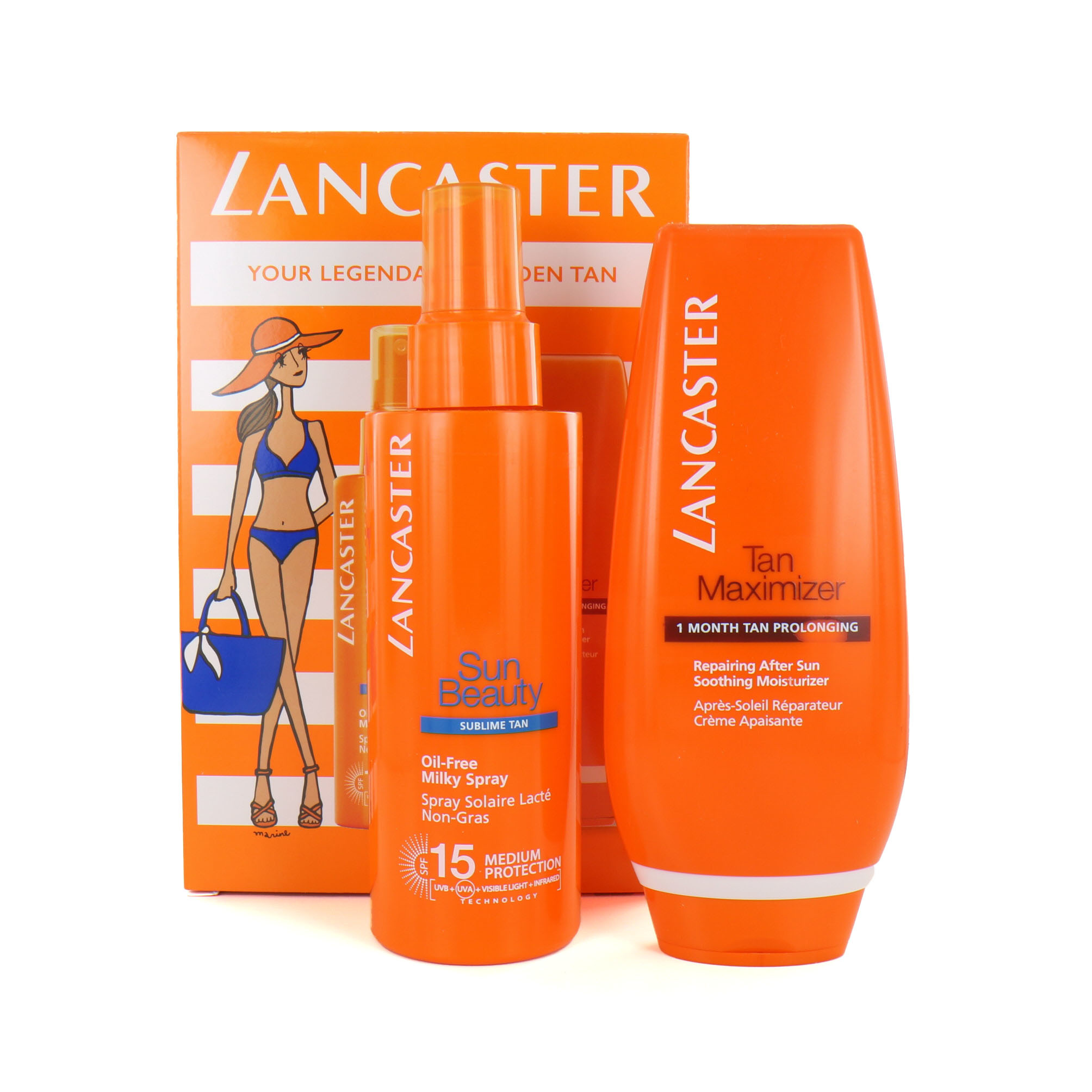 De Lancaster Sun Beauty Sublime Tan Milky Spray + Tan Maximizer - 150 ml + 125 ml (SPF 15) maakt het mogelijk om te veilig te zonnen. De set bevat een zonnebrand met SPF15, zodat je huid beschermd is tegen UV straling. Daarnaast zit er in de set ook een Aftersun, waar je je huid na het zonnen mee kunt verzorgen.