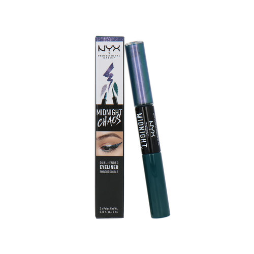 De NYX Midnight Chaos Dual Ended Eyeliner - Teal/Metaphysical laat je ogen stralen. Het product is dubbelzijdig, aan de ene kant een vloeibare eyeliner en aan de andere kant een gekleurde eyeliner met glitter finish. Het product blijft goed zitten en is intens gepigmenteerd.