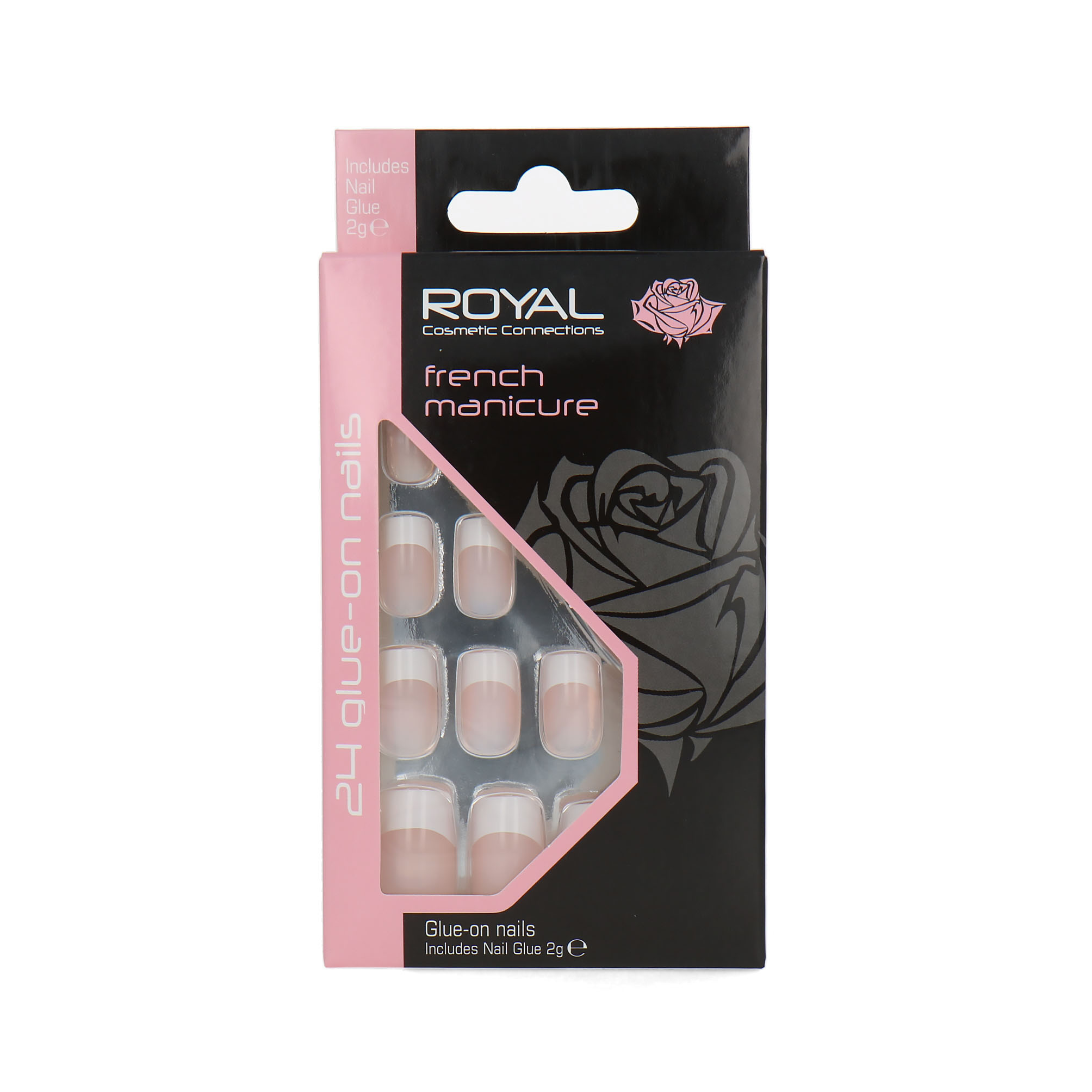 De Royal 24 Glue-On Nail Tips - French Manicure (met nagellijm) is een set met 24 sterke kunstnagels. De kunstnagels blijven goed zitten en de set is voorzien van nagellijm.
